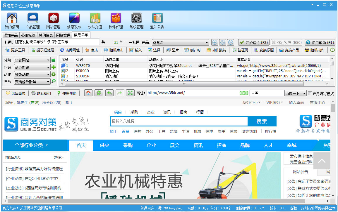 软件可以实现任何大型B2B网站发布信息:包括门户博客、大型论坛、文章投递、分类信息、贴吧问吧、WIKI百科、相册、新闻评论,各种中小博客、分类信息、公司网站、问答平台、自问自答、投票、注册账号、加网站好友、加粉丝、抢沙发、重新编辑、替换内容、批量刷新、修改、删除等功能、文章采集、伪原创处理、自动加连接、文章串联、友情链接、签名档设置等功能,包揽了所有的发布领域。甚至他还可以模拟代替手工玩网页游戏、看小说、微信网页好友信息发布。一句话概括:只要这个平台您能用鼠标点击,能用键盘输入,那么我们的软件就可以实现。